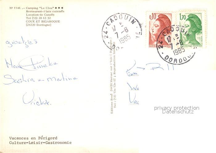 13090540 carte postale Coux-et-Bigaroque Camping Le Clou Dordogne postalisch gelaufen Erhaltung siehe scans [NatalD47] KatCode: 11170024424142