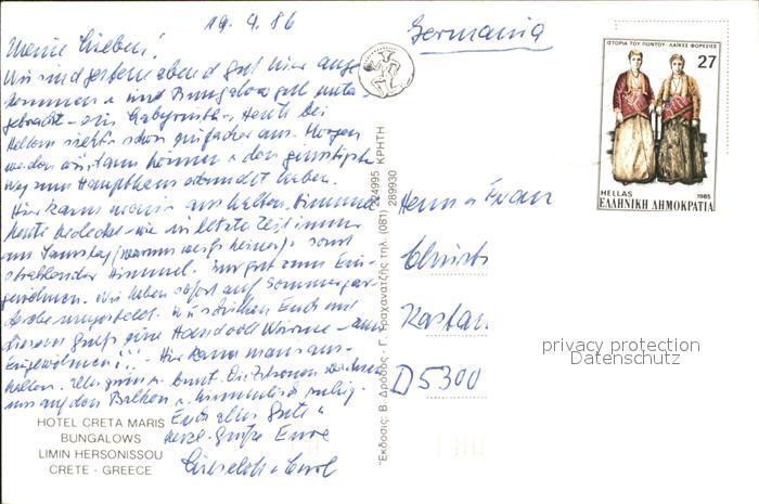 old postcard Crete Kreta Hotel Kreta Maris postalisch gelaufen Erhaltung siehe scans