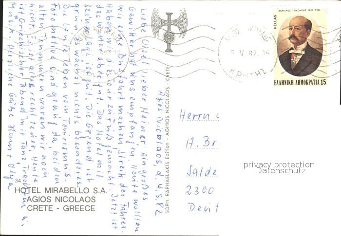 old postcard Crete Kreta Hotel Mirabello S. A. postalisch gelaufen Erhaltung siehe scans