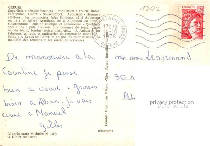 13592352 Creuse Departement Carte de la région et ses villes postalisch gelaufen Erhaltung siehe scans [FriedD77] carte postale Frie Katcode 11170023123008
