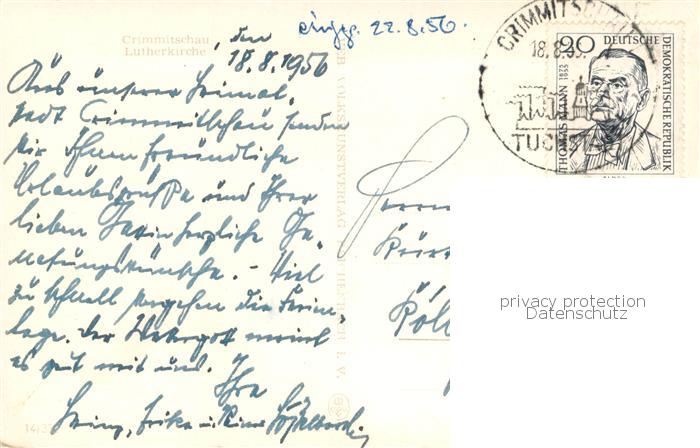 73777943 alte Postkarte Crimmitschau Lutherkirche postalisch gelaufen Erhaltung siehe scans [FriedD77] KatCode: 11110014193020