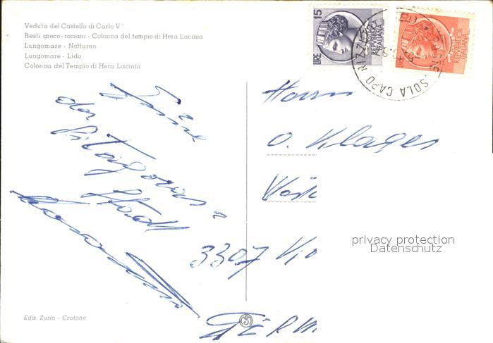 old postcard Crotone Castello di Carlo V Tempio di Hera Lacinia postalisch gelaufen Erhaltung siehe scans