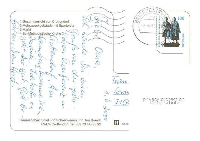 73840897 alte Postkarte Crottendorf Erzgebirge Panorama Mehrzweckgebaeude Sportplatz Markt Kirche postalisch gelaufen Erhaltung siehe scans [FriedD77] KatCode: 11110014171050