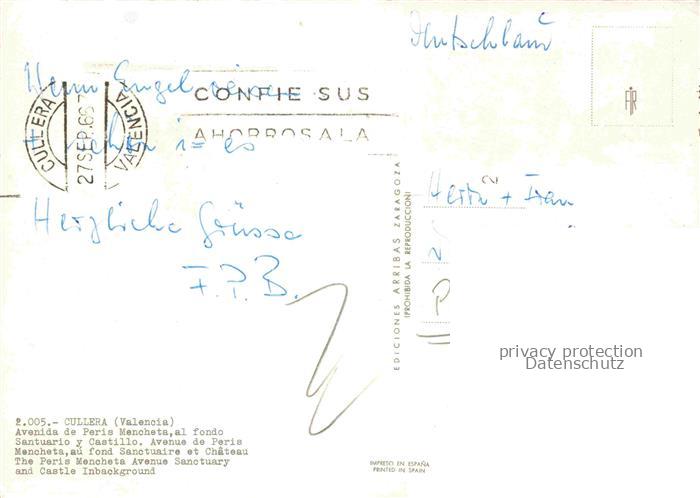 74116497 Cullera VALENCIA Valenciana ES Avenida de Paris Mancheta as fondo Santuario y Castillo postalisch nicht gelaufen Erhaltung siehe scans [WerneD78] KatCode: 11510