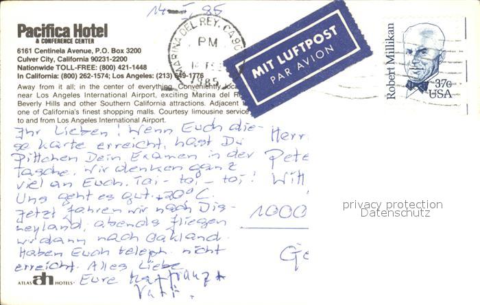 72161951 old postcard Culver City Pacifica Hotel postalisch gelaufen Erhaltung siehe scans KatCode: 14140050000000
