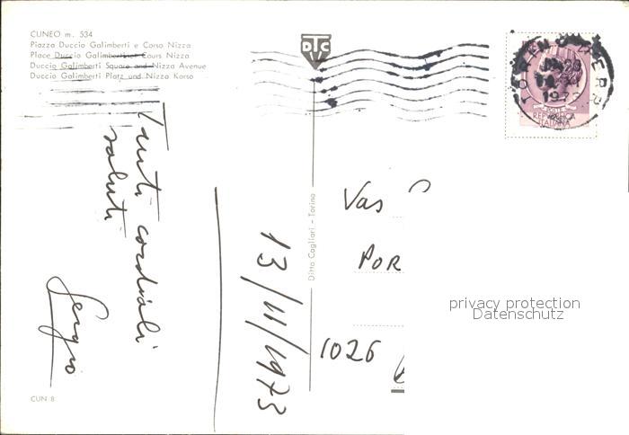 old postcard Cuneo Piazza Duccio Galimberti e Corso Nizza Denkmal Alpen postalisch gelaufen Erhaltung siehe scans