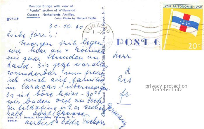 Curacao Willemstad Niederlaendische Antillen Pontoon Bridge with view of Punda section of Willemstad postalisch gelaufen Erhaltung siehe scans [WerneD78] alte Postkarte Wern Katcode 16190