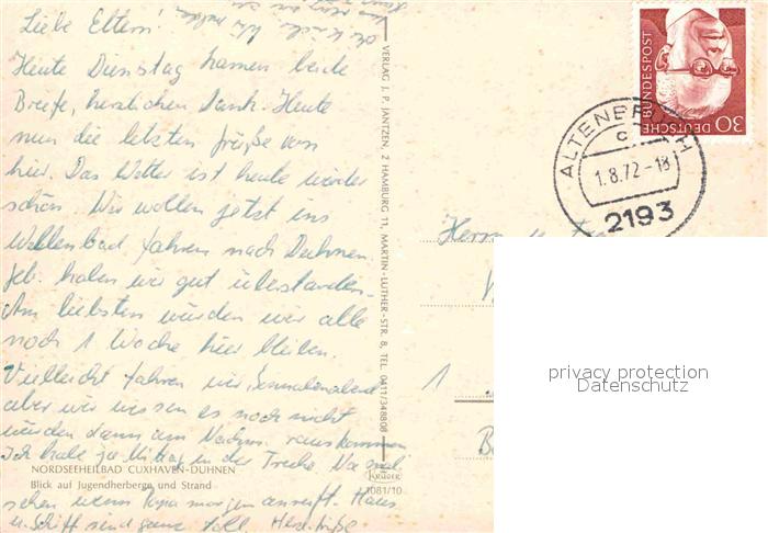 72706221 alte Postkarte Cuxhaven Duhnen Nordseebad Jugendherberge und Strand postalisch gelaufen Erhaltung siehe scans [WerneD78] KatCode: 11110003352011
