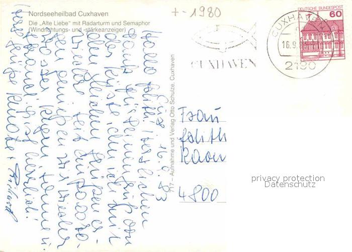 72899182 alte Postkarte Cuxhaven Nordseebad Alte Liebe und Radarturm mit Semaphor postalisch gelaufen Erhaltung siehe scans [LiesaD40] KatCode: 11110003352011