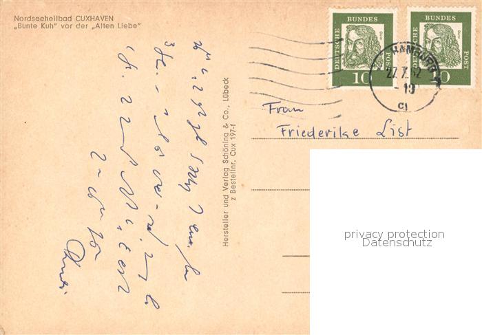 73294269 alte Postkarte Cuxhaven Nordseebad Bunte Kuh vor der Alten Liebe postalisch gelaufen Erhaltung siehe scans [FriedD77] KatCode: 11110003352011
