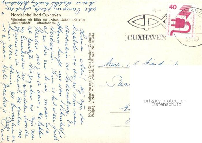 72935726 alte Postkarte Cuxhaven Nordseebad Faehrhafen mit Blick zur Alten Liebe Steubenhoeft Luftaufnahme postalisch gelaufen Erhaltung siehe scans [FriedD77] KatCode: 11110003352011