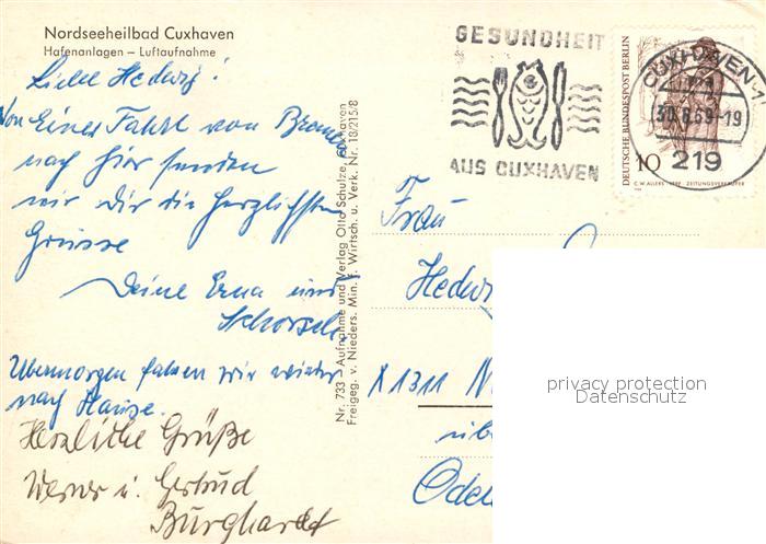73170538 alte Postkarte Cuxhaven Nordseebad Hafenanlagen Fliegeraufnahme postalisch gelaufen Erhaltung siehe scans [FriedD77] KatCode: 11110003352011