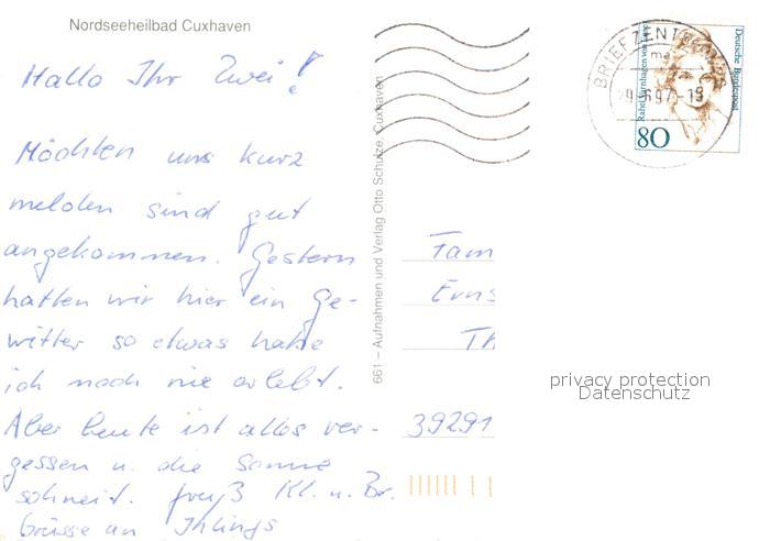 73159639 alte Postkarte Cuxhaven Nordseebad Marina mit Feuerschiff Elbe 1 Alte Liebe Kugelbake Schloss Ritzebuettel Fischereihafen Grimmershoernbucht Fliegeraufnahme postalisch gelaufen Erhaltung siehe scans [FriedD77] KatCode: 11110003352011