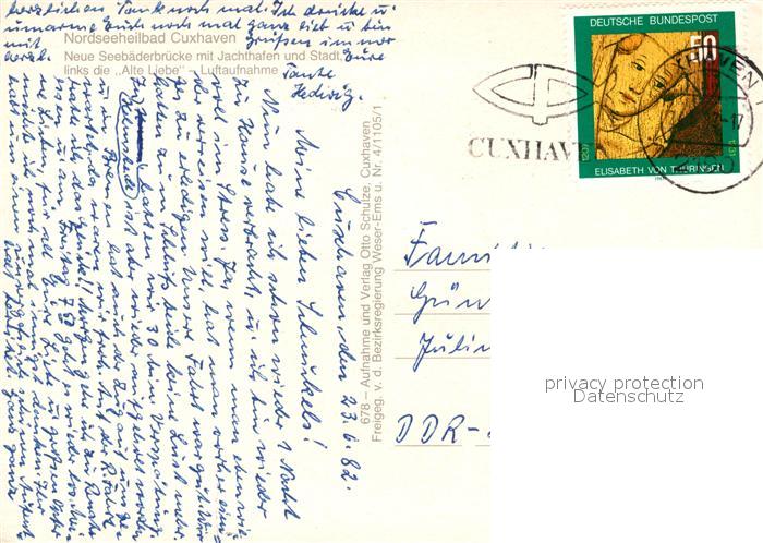 73097865 alte Postkarte Cuxhaven Nordseebad Neue Seebaederbruecke mit Jachthafen und Stadt mit Alte Liebe Fliegeraufnahme postalisch gelaufen Erhaltung siehe scans [WerneD78] KatCode: 11110003352011