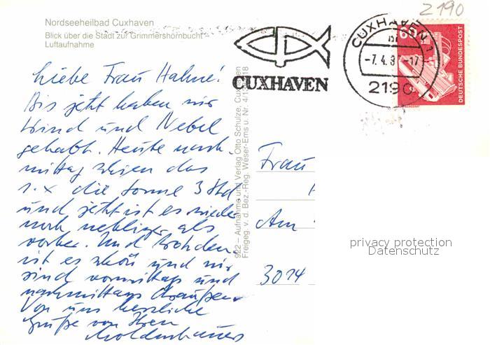 72913549 alte Postkarte Cuxhaven Nordseebad Stadtbild mit Grimmershoernbucht Fliegeraufnahme postalisch gelaufen Erhaltung siehe scans [FriedD77] KatCode: 11110003352011