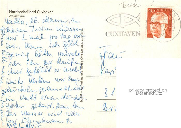 72992318 alte Postkarte Cuxhaven Nordseebad Wasserturm postalisch gelaufen Erhaltung siehe scans [WerneD78] KatCode: 11110003352011