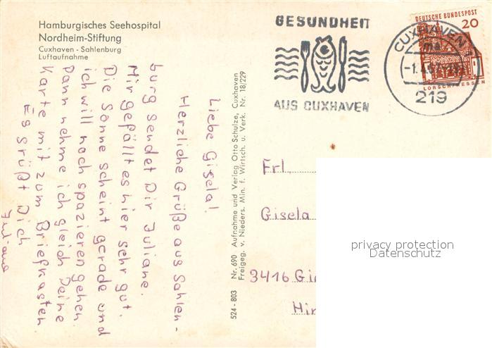73637102 alte Postkarte Cuxhaven Sahlenburg Nordseebad Hamburgisches Seehospital Nordheim Stiftung Fliegeraufnahme postalisch gelaufen Erhaltung siehe scans [WerneD78] KatCode: 11110003352011