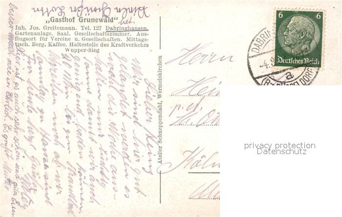 33086424 alte Postkarte Dabringhausen Gasthaus zum Grunewald postalisch gelaufen Erhaltung siehe scans [LiesaD40] KatCode: 11110005378032