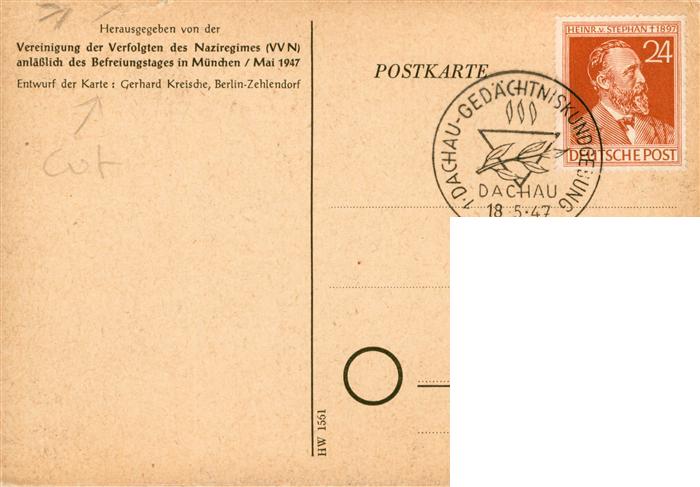 73877960 Dachau Befreiungsfeier Dachau 1947 Kuenstlerkarte Sonderstempel postalisch nicht gelaufen Erhaltung siehe scans [FriedD77] KatCode: 11110009174115