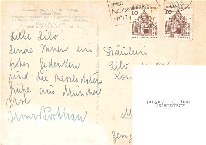 72764296 alte Postkarte Dachau Schloss-Caf? Terrassenrestaurant postalisch gelaufen Erhaltung siehe scans [LiesaD40] KatCode: 11110009174115