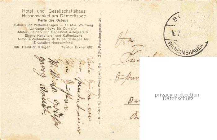 74027955 alte Postkarte Daemeritzsee Hessenwinkel BERLIN Gesellschaftshaus Hessenwinkel Bootshafen postalisch gelaufen Erhaltung siehe scans [WerneD78] KatCode: 11110011000000