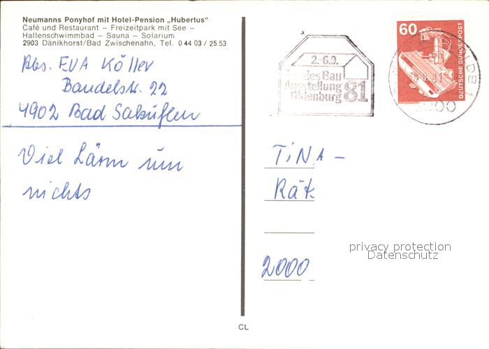 72071693 alte Postkarte Daenikhorst Neumanns Ponyhof mit Hotel Pension Hubertus Gaststube Bar Hallenbad Brunnen postalisch gelaufen Erhaltung siehe scans KatCode: 11110003451002