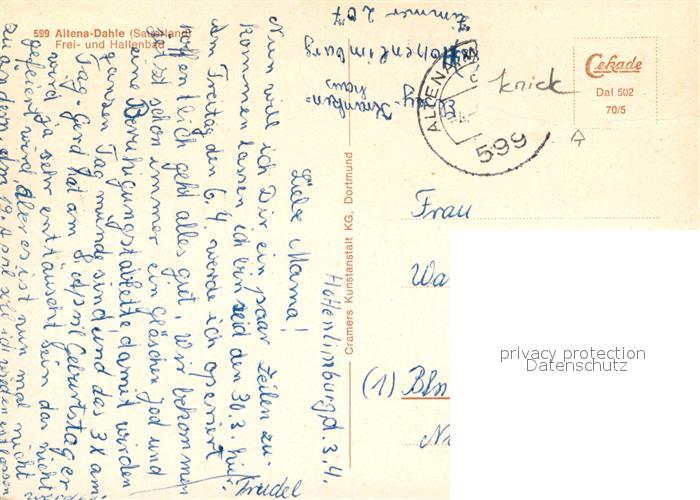 72960922 alte Postkarte Dahle Altena Fliegeraufnahme Freibad und Hallenbad postalisch gelaufen Erhaltung siehe scans [LiesaD40] KatCode: 11110005962004