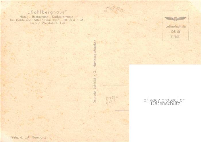 72724787 Dahle Altena Fliegeraufnahme Kohlberghaus Hotel Restaurant postalisch nicht gelaufen Erhaltung siehe scans [LiesaD40] KatCode: 11110005962004