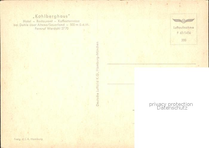 72496290 Dahle Altena Kohlberghaus Hotel Restaurant Kaffeeterrasse Fliegeraufnahme postalisch nicht gelaufen Erhaltung siehe scans KatCode: 11110005962004