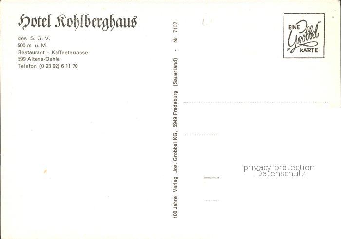 72034613 Dahle Altena SGV Hotel Kohlberghaus Burg Seilersee Iserlohn Moehnesee Klustenstein Hoennetal Sorpesee Wappen postalisch nicht gelaufen KatCode: 11110005962004