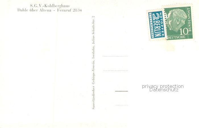 73779511 Dahle Altena SGV Kohlberghaus postalisch nicht gelaufen Erhaltung siehe scans [FriedD77] KatCode: 11110005962004