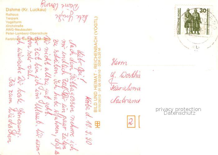 72953547 alte Postkarte Dahme Mark Rathaus Tierpark Vogelturm Kirchstrasse AWG Neubauten Peter Lamberz Oberschule postalisch gelaufen Erhaltung siehe scans [WerneD78] KatCode: 11110012072053