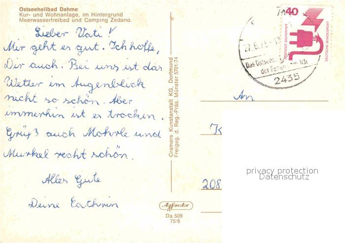72835152 alte Postkarte Dahme Ostseebad Kur- Wohnanlage Meerwasserfreibad Camping Zedano postalisch gelaufen Erhaltung siehe scans [NatalD47] KatCode: 11110001055010