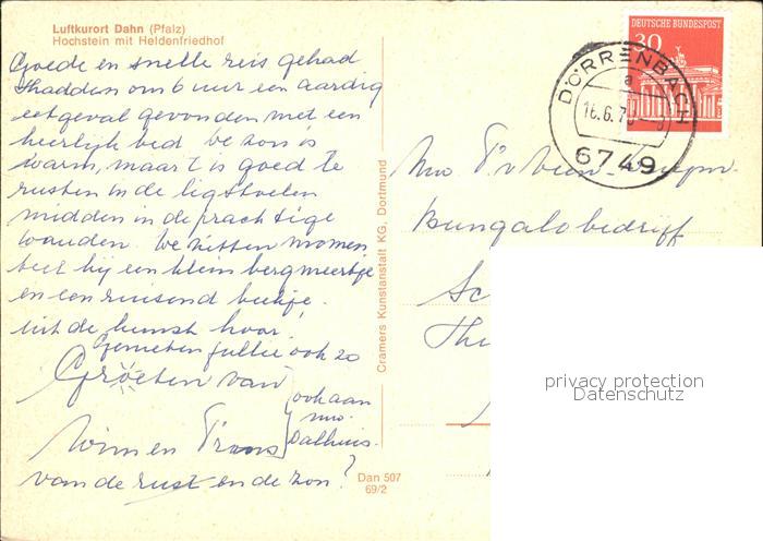 72615019 alte Postkarte Dahn Hochstein Heldenfriedhof postalisch gelaufen Erhaltung siehe scans [NatalD47] KatCode: 11110007340004