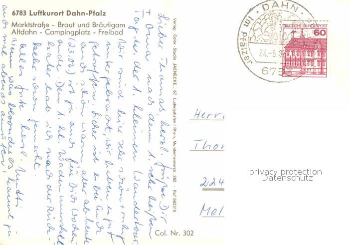 72783530 alte Postkarte Dahn Marktstrasse Braut und Braeutigam Altdahn Campingplatz Freibad postalisch gelaufen Erhaltung siehe scans [WerneD78] KatCode: 11110007340004