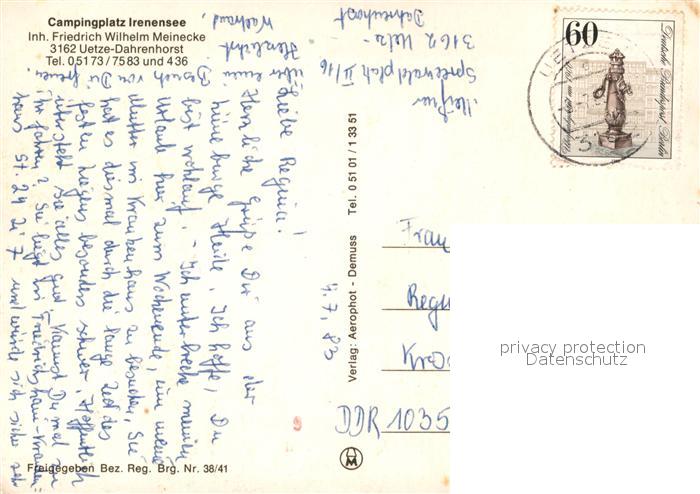 73599994 alte Postkarte Dahrenhorst Campingplatz Irenensee Fliegeraufnahme postalisch gelaufen Erhaltung siehe scans [FriedD77] KatCode: 11110003241018