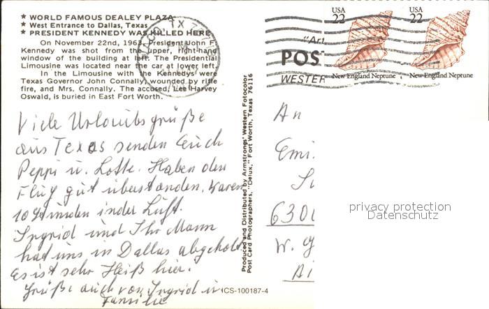 72592274 old postcard Dallas Texas Dealey Plaza postalisch gelaufen Erhaltung siehe scans [AndreD76] KatCode: 14140460000000