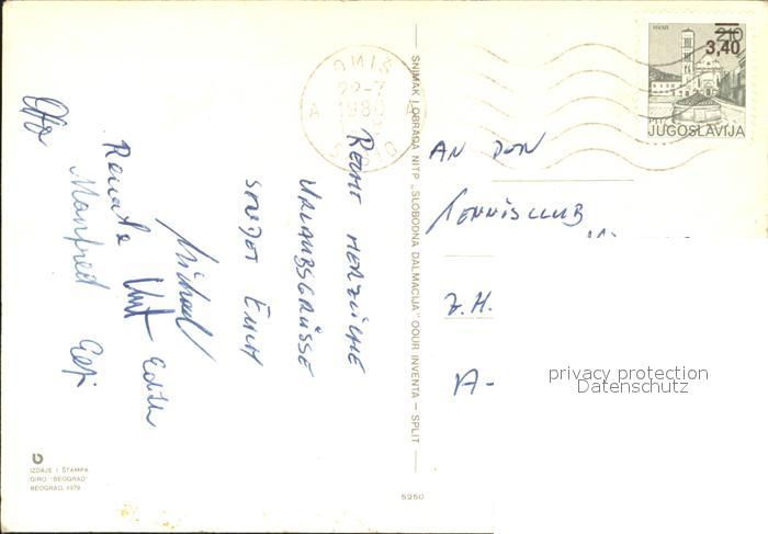 old postcard Dalmacija Omis Kirche Strand Fliegeraufnahme postalisch gelaufen Erhaltung siehe scans