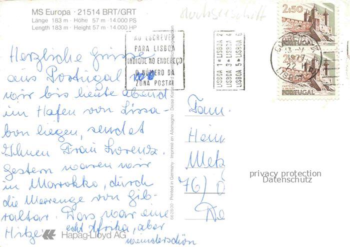 74051973 alte Postkarte Dampfer Binnenschifffahrt MS Europa 21514 BRT/GRT postalisch gelaufen Erhaltung siehe scans [IrynaD87] KatCode: 22480000000100