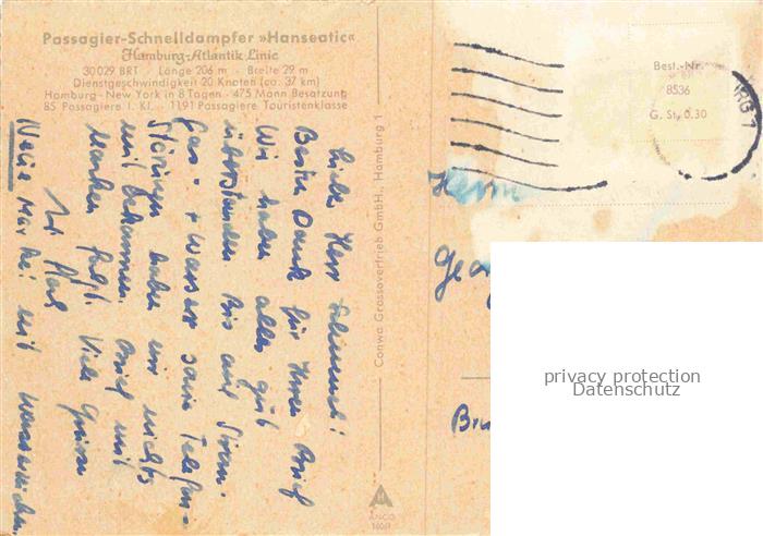 74031201 alte Postkarte Dampfer Binnenschifffahrt Schnelldampfer Hanseatic Hamburg Atlantik Linie postalisch gelaufen Erhaltung siehe scans [IrynaD87] KatCode: 22480000000100