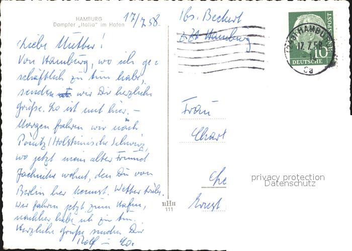 alte Postkarte Dampfer Oceanliner Italia Hamburg Hafen postalisch gelaufen Erhaltung siehe scans