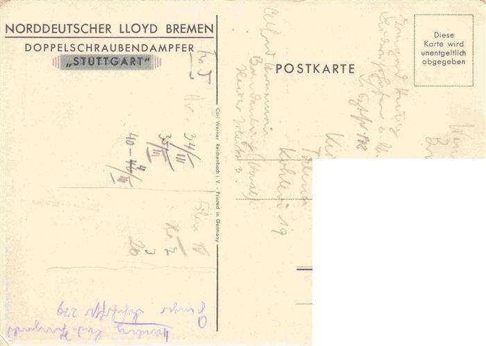 74007198 alte Postkarte Dampfer Oceanliner LLOYD Bremen Doppelschraubendampfer Stuttgart postalisch gelaufen Erhaltung siehe scans [IrynaD87] KatCode: 22480000000700