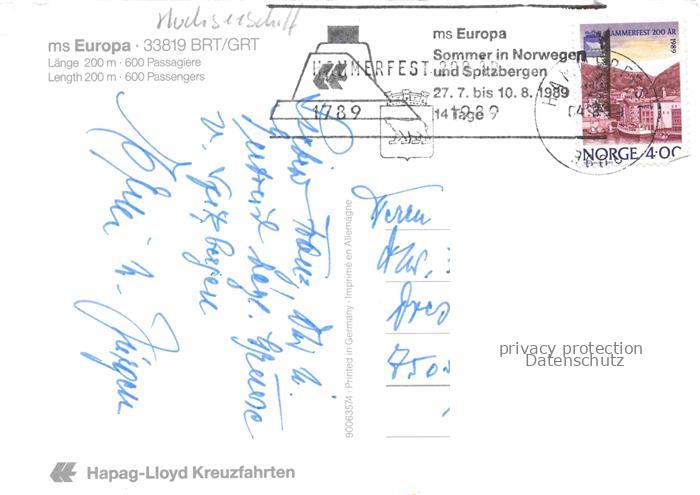 74051966 alte Postkarte Dampfer Oceanliner MS Europa 33819 BRT/GRT postalisch gelaufen Erhaltung siehe scans [IrynaD87] KatCode: 22480000000700