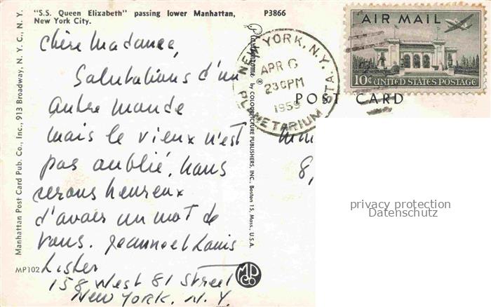 74076429 alte Postkarte Dampfer Oceanliner S.S. Queen Elizabeth New York City postalisch gelaufen Erhaltung siehe scans [IrynaD87] KatCode: 22480000000700