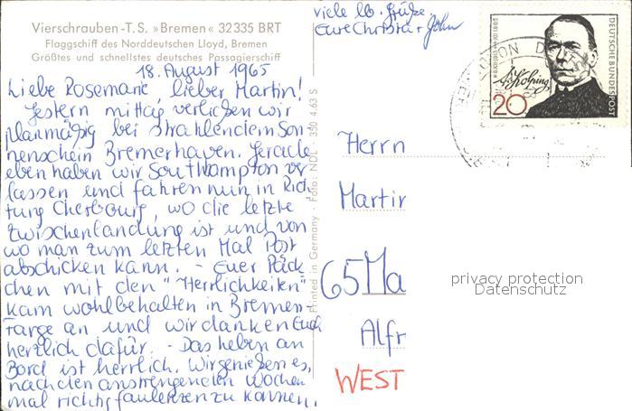 alte Postkarte Dampfer Oceanliner TS Bremen postalisch gelaufen Erhaltung siehe scans