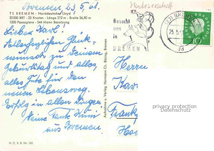 74051912 alte Postkarte Dampfer Oceanliner TS Bremen Norddeutsche Llyon postalisch gelaufen Erhaltung siehe scans [IrynaD87] KatCode: 22480000000700