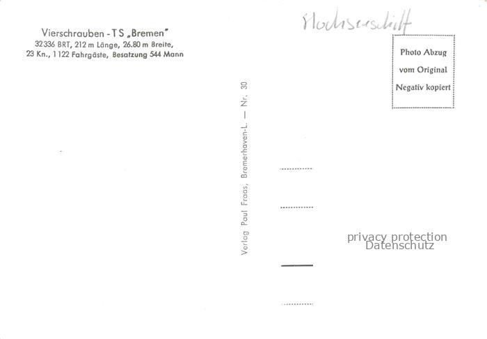 74051696 Dampfer Oceanliner TS Bremen Vierschrauben postalisch nicht gelaufen Erhaltung siehe scans [IrynaD87] KatCode: 22480000000700
