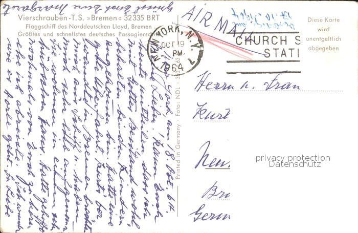 alte Postkarte Dampfer Oceanliner Vierschrauben T.S. Bremen postalisch gelaufen Erhaltung siehe scans