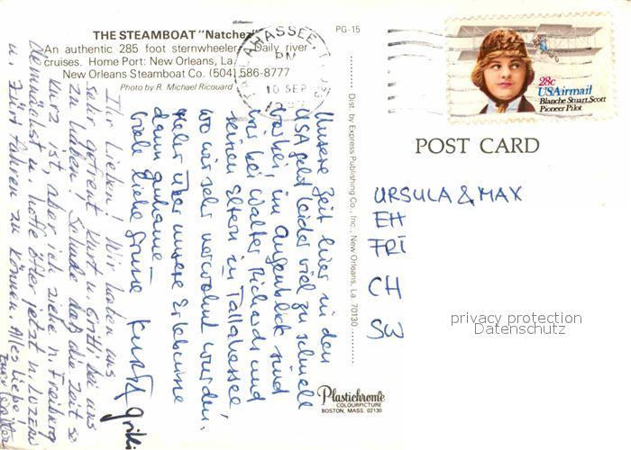 alte Postkarte Dampfer Schaufelrad Steamboat Natchez New Orleans postalisch gelaufen Erhaltung siehe scans [PaolaD17]