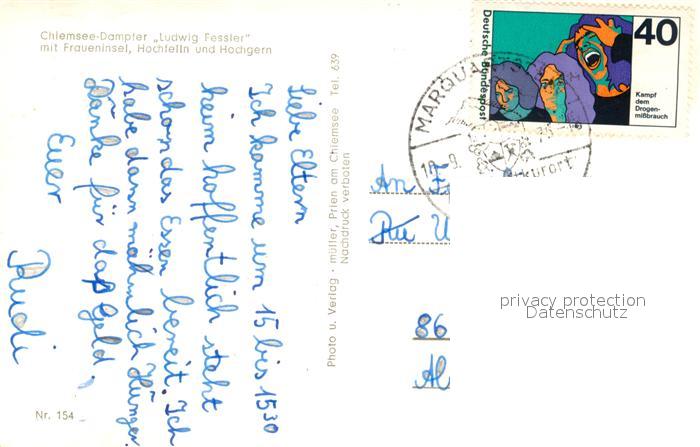 alte Postkarte Dampfer Seitenrad Ludwig Fessler Chiemsee Fraueninsel Hochfelln Hochgern postalisch gelaufen Erhaltung siehe scans [PaolaD17]